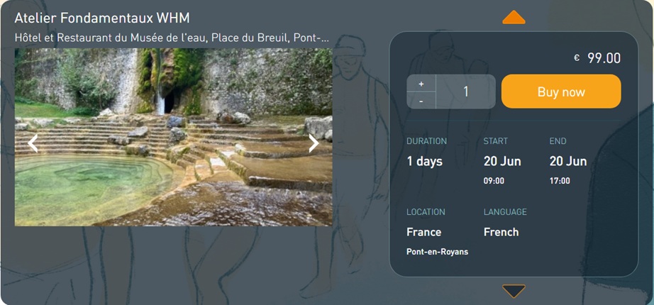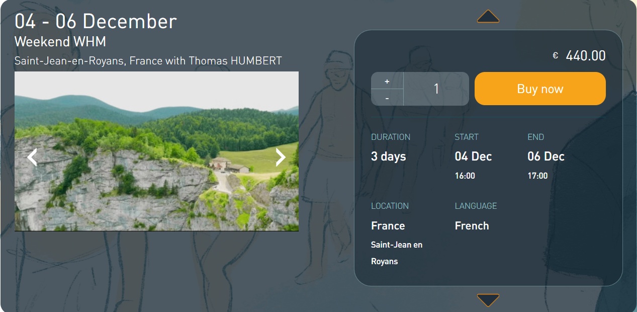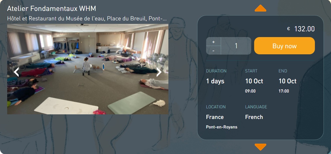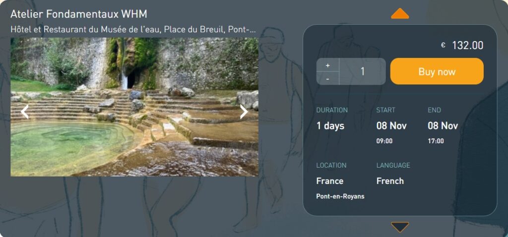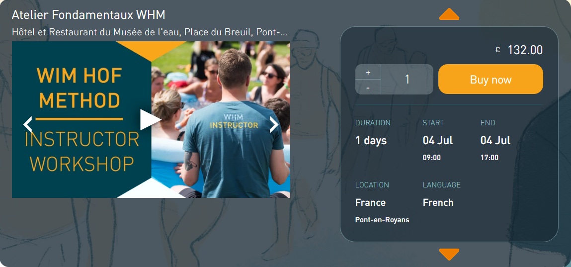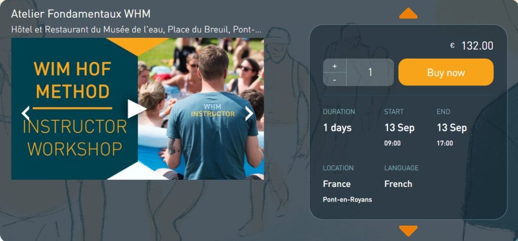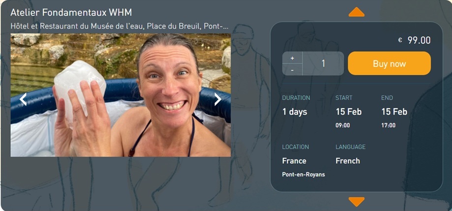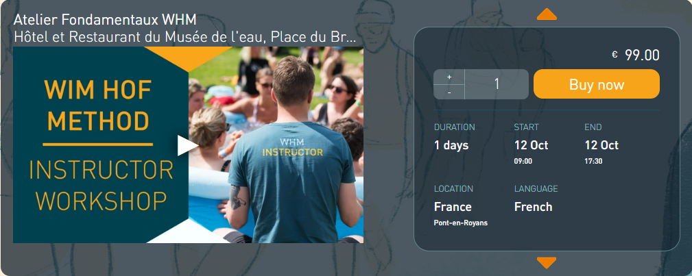 Pour réserver tout de suite votre place à l’un des prochains ateliers, il vous suffit de cliquer ci-dessous sur l’image correspondant à votre date préférée ou dans la liste ci-dessous, vous serez alors redirigé instantanément vers la page dédiée de la plate-forme de réservation en ligne sur le site officiel de la méthode WimHof.